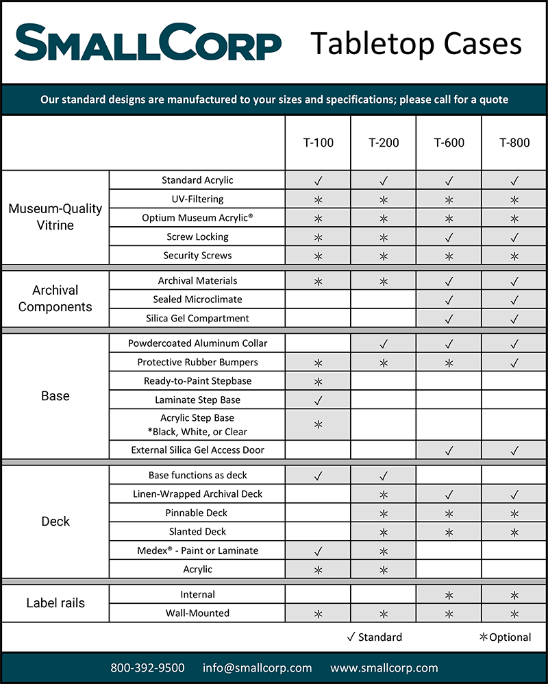 From ephemera to antiquities, protect your precious artifact with a tabletop case. Be it a personal collection, a popup exhibition, or a permanent gallery, SmallCorp offers case options to ensure a sophisticated presentation ranging from step base cases that keep dust out, to sealed microclimate tabletop cases. Typically placed on a table or desk, tabletop cases are a compact display case solution. Most SmallCorp tabletop cases may be customized with options including acrylic or glass vitrines, slanted and pinnable decks, risers wrapped in stock or custom fabrics, LED lighting, label holders, and more.