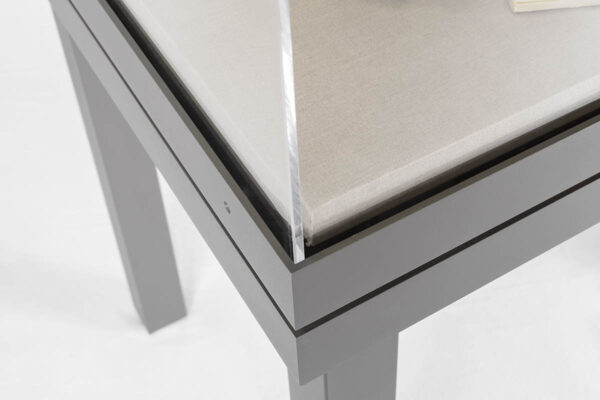 The D-200’s 5-sided, acrylic vitrine can be lifted off for access to objects and is secured to the aluminum collar with screws. An archival silicone gasket creates a seal between the vitrine and the case frame. We manufacture museum-quality acrylic vitrines from clear or UV-filtering acrylic and are one of the few companies to manufacture museum-quality Optium Museum Acrylic® vitrines