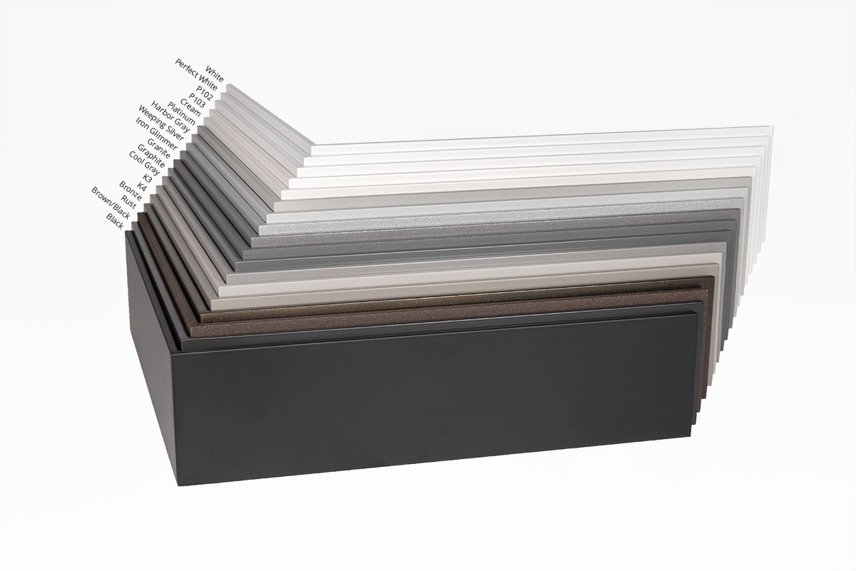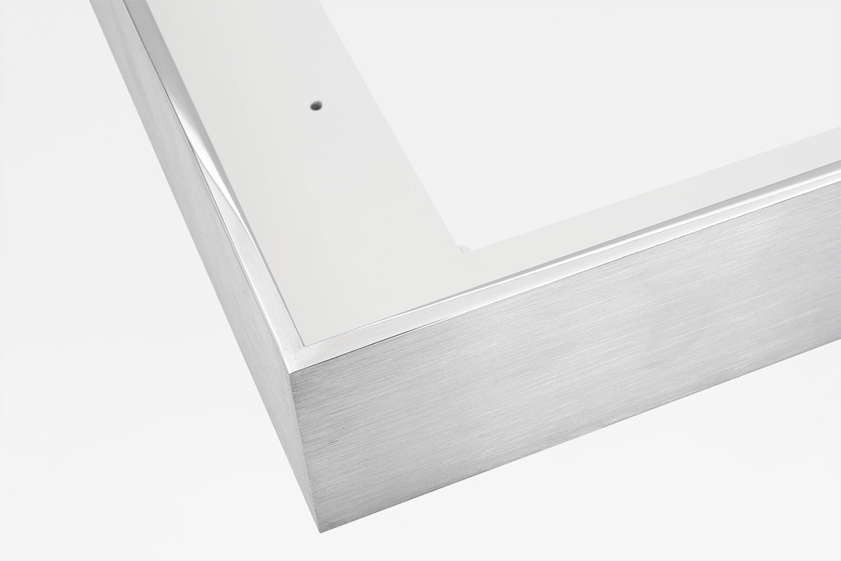 We also offer brushed sides and face, random orbital (RO) sanded exterior finish, and in addition to the classic black-painted interior, we offer a white-painted interior as an option. We do not brush, polish, or apply a sanded finish on the interior of our floater frames. We do, however, offer 18 different powdercoat colors if you would like the same finish inside and out.