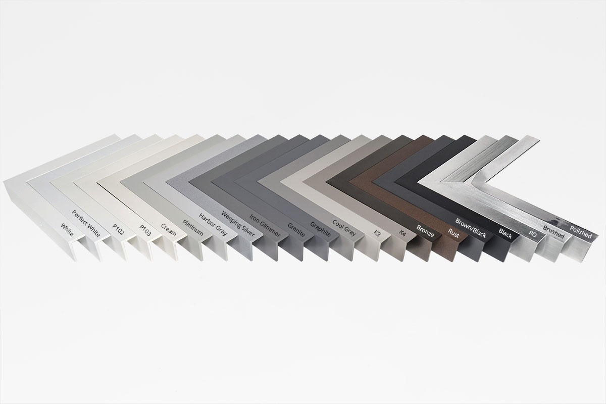 We also offer brushed sides and face, a random orbital (RO) finish, and 18 different powdercoat colors. Scroll down to see powdercoat chip chart or to request one.